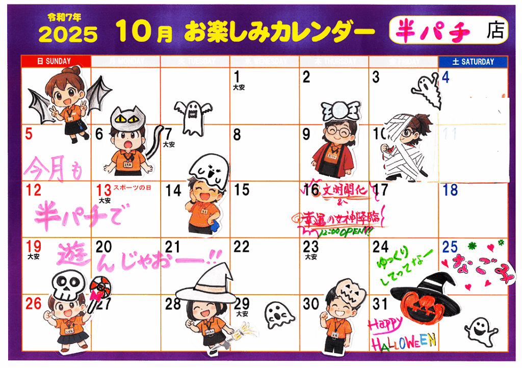 半パチ店では、お客様に最高に楽しんでいただくために、アソシエイト全員がエンターテイメントを目指しています!皆様に、ご遊技で楽しんで頂くのはもちろんですが、毎月、季節の催しや、食品フェアー、お楽しみ企画など、私たちアソシエイトが企画するエンターテイメントで、お客様をおもてなし、より一層楽しんで頂くよう努めて参ります。ぜひ、私たちが企画するエンタメにご参加頂き、ともに楽しい時間をお過ごしください!