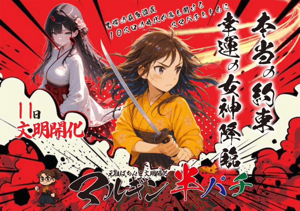 全国初の全台半額はもちろんのこと、パチンコ業界で一般的な画一化されたサービスとは一線を画し、マルギン半パチ店では独自の接客サービスを提供しています。全国初の全台半額のお店として2005年オープンした当時の来店されたお客様から、「まさに、パチンコの文明開化」との声をいただきました。その、「パチンコ文明開化」というお言葉を、オープン以来、20年に渡り今日に至るまで、大事に使わせて頂いております。